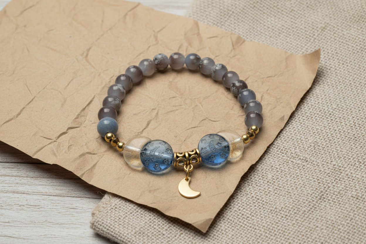 The Celestial Moon Charm Gemstone Bracelet is a soulful blend of earthy grounding and celestial beauty. Designed with soft gray gemstone beads, dreamy blue patterned focal beads, and warm gold-tone accents, this stretch bracelet feels both calming and quietly powerful. A delicate gold crescent moon charm adds symbolic meaning, representing intuition, balance, and new beginnings.